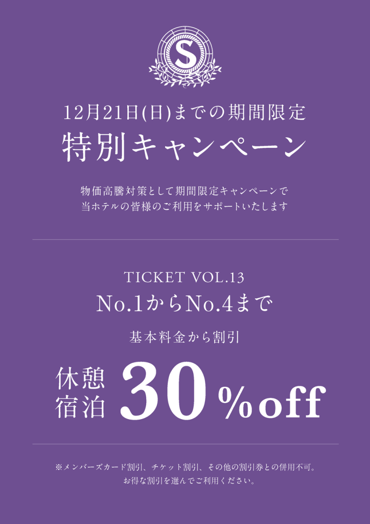 2025年12月1日(月)から12月21日(日)までの期間中、TICKET VOL.13のNo.1からNo.4までのご利用で、休憩・ご宿泊の基本料金がなんと30%OFFとなります!